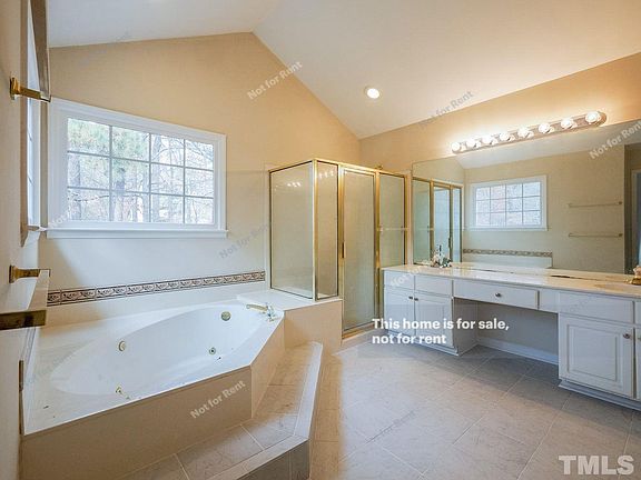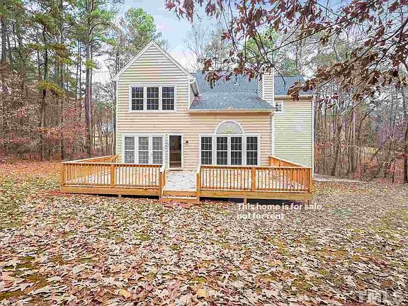 This Raleigh two-story home offers a den, office, gas fireplace, kitchen secretary nook, master bathroom dual sink, separate tub and shower, open deck, and a two-car garage.