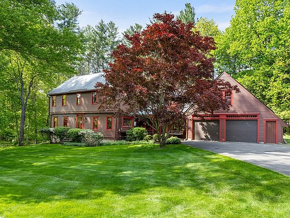 Welcome home to this sprawling 3-bedroom, 3.5-bath Colonial, privately nestled on over 2 acres of park-like lawns and mature plantings. The flexible floor plan features large rooms that exude warmth and charm. The formal living room boasts beautiful hardwood floors, a central fireplace, and a beamed ceiling, with access to the expansive back deck.The country kitchen includes an adjoining dining area and leads to a stunning family room with a cathedral ceiling, loft area, and full bath. Upstairs, you'll find three spacious bedrooms, including an oversized primary suite with a loft and walk-in closet, along with two full baths and bonus The large unfinished walkout basement offers customization potential, while central AC and solar panels enhance your energy efficiency. Ideally located near conservation areas, Route 3, and the New Hampshire border, this home is perfect for those seeking tranquility and convenience. Discover all the reasons you'll love this exceptional property!