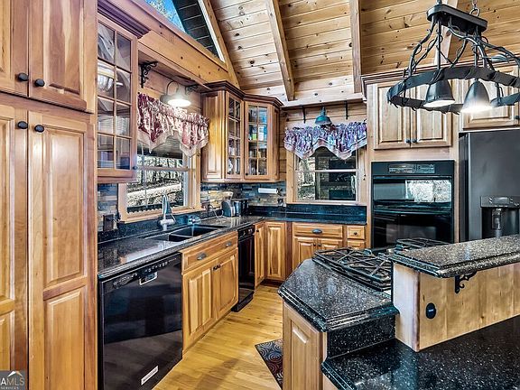Beautiful log cabin in the woods offering year-round mountain views and stunning sunsets. This spacious home features three finished levels, each with its own bedroom, full bathroom. The kitchen includes custom cabinets, granite countertops, a 5-burner gas stove, French-door refrigerator, convection oven/microwave, compactor, and disposal. Enjoy long-range vistas from the spacious dining room. A dual-zone HVAC system provides comfort on every level. The main and upper-level bedrooms each open to private decks overlooking the mountains, perfect for morning coffee or evening relaxation. Enjoy approx. 1,200 sq ft of covered decking, a wood-burning exterior fireplace with outdoor TV entertainment area, and a brand-new hot tub on the covered porch. The main floor offers a warm, inviting living room with a gas fireplace, plus a dining area framed by large windows showcasing the mountain views. The terrace level includes a family room with a gas fireplace and access to another mountain-view deck. The yard is fully fenced, ideal for pets or outdoor enjoyment. This beautiful mountain home comes partially furnished and is perfect for a short-term rental-see Seller's Property Disclosure for a complete list. Conveniently located just minutes from Blue Ridge or Blairsville for great shopping, excellent dining, and year-round events and festivals. Won't last long!