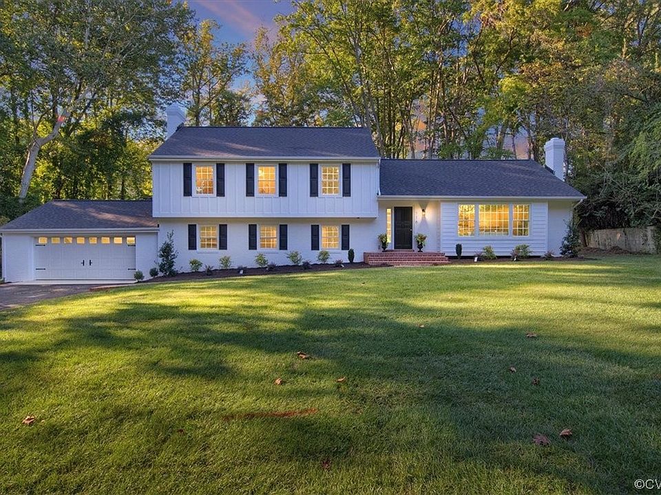 You are going to LOVE this FULLY RENOVATED, 4 bedroom, 2.5 bathroom, 2600+ square foot home w/ a 2.5 car garage, situated on a 1.1 ACRE lot in the sought after Roslyn Hills/Countryside neighborhood of Tuckahoe. Features/Upgrades include; NEW 30 year dimensional shingled roof, NEW vinyl energy efficient windows, NEW hardiplank siding, NEW dual zone HVAC systems, NEW quartz counters, Refinished hardwoods throughout, Fresh Paint, NEW lighting & more! As you pull into the freshly paved, brick-lined driveway you're greeted by a professionally landscaped yard with new sod, decorative rock beds & tons of curb appeal. Entering the home handsome hardwoods flow throughout. The large living room offers recessed lighting, a brick fireplace & opens to the gorgeous kitchen w/ oversized island, stainless appliances, floating shelves & pantry w/ barn door. The dining room boasts vaulted ceilings & opens to the brick patio overlooking the private backyard & peaceful creek. Upstairs are 4 bedrooms & 2 full baths. The primary suite features decorative barn doors, ensuite bath with dual vanities & floor to ceiling tiled shower. The basement showcases the family room, laundry, mud room & garage access.