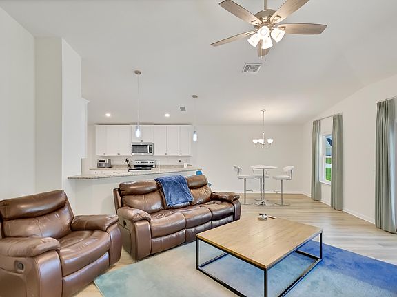 Seller is offering $5000 to assist with buyer's closing costs with acceptable offer. This impeccable home is better than new and includes numerous upgrades including vinyl plank flooring throughout, granite countertops in kitchen and baths, white cabinets with crown molding, beautiful pendant lights over breakfast bar, epoxy flooring in garage, gutters and tinted windows. This is one of the larger one story floor plans with a large master bedroom and bath and walk-in closet. You will be impressed with the condition of this home. It was recently pressure washed, deep cleaned and gutters cleaned out. The home has a hip roof and lightning rods which should lower your homeowners insurance. Refrigerator and custom blinds are also included. Step out of your living room on the large covered patio with ceiling fan. The community pool is very close for your enjoyment. There is a walking path designated for owners to four mile creek. Riverwalk is convenient to the Publix shopping center and only about a 20 minute drive to the beach and numerous shopping and restaurants. This home is move in ready. Don't miss out on this one!