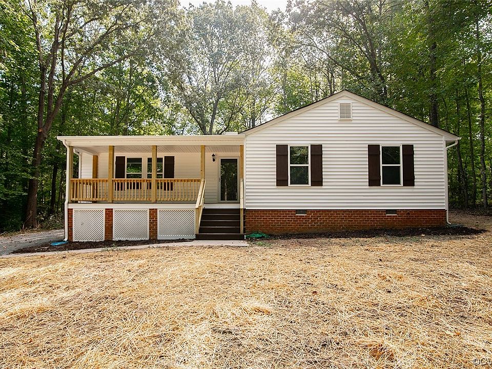 Welcome to your new home! This 3 bed/2 full bath rancher sits on a .93 acre lot and has been COMPLETELY RENOVATED. Greeted first by a country porch, you'll walk into a spacious living room with a vaulted ceiling. Open to the dining area, the kitchen has been completely updated and provides a wonderful view into the backyard. Access to the rear deck is just outside the kitchen and past the laundry room. Down the hall, you have an updated full bath which services two spacious bedrooms, and the primary suite with a full bath, including a stand up shower. NEW UPDATES INCLUDE: roof, vinyl siding, high efficiency windows, luxury vinyl plank flooring, carpet, completely updated bathrooms AND kitchen (vanities, cabinets, countertops, appliances), new rear deck, front porch posts and railings, gutters, fresh paint, light fixtures, AND new insulation in the crawlspace. Whew! All of this, plus you'll be located just 2 miles from route 360 and only about 20 minutes to Mechanicisville.