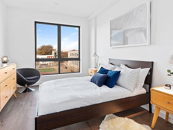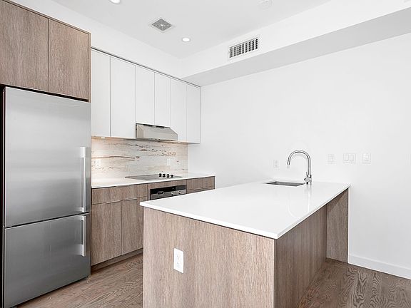 Available for May 1st occupancy. Experience this Bushwick gem featuring contemporary modern design capturing sunlight through nearly full-wall windows with great open city views. This split two bedroom, two bathroom on the fourth floor of this elevator building boast a large private western facing balcony, perfect for hosting or enjoying outdoor dining. The open layout features grey satin-finished oak floors and a designer kitchen of Arctic White quartz countertops, custom cabinetry, and top-of-the-line stainless steel appliances. Central heating and cooling offers pleasant and quiet comfort for every season. The primary bedroom offers an ensuite bath with variegated floor-to-ceiling white subway tiles, modern fixtures, deep soaking tub, and expansive custom vanities. Nearby trains include the L at Wilson Avenue ready to bring you to Williamsburg and Manhattan. The Halsey Street J train takes you to Williamsburg or the Manhattan in 9 stops or less.