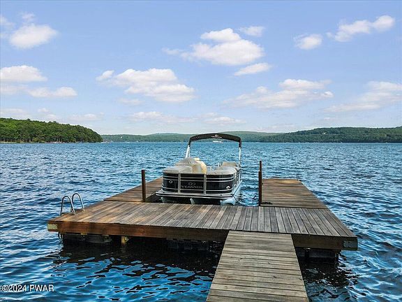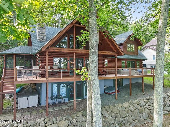 Custom Built Log Home w/ over 100' of Frontage on Lake Wallenpaupack. Gorgeous home optimized for lake living featuring an open floor plan with breath-taking views, an impressive kitchen, complete with a spacious island, sleek countertops, and state-of-the-art appliances, relax and unwind in the inviting living room w/ bluestone stone wood burning fireplace, cozy screened in breakfast room, oversized loft area, ideal for a home office or additional lounging space. Incredible master suite, ample WIC, a luxurious ensuite bath, and panoramic vistas of the lake, finished lower level complete with bar ready for entertaining. Enjoy the covered front porch and easy access to the lake, beautifully landscaped with bluestone patios and walkways. Complete with detached garage w/ basement storage and U-shaped dock. Meticulously kept and thoughtfully designed, this Lake Wallenpaupack lakefront home offers a rare opportunity to experience the beauty and tranquility of lakeside living in unparalleled comfort and style.