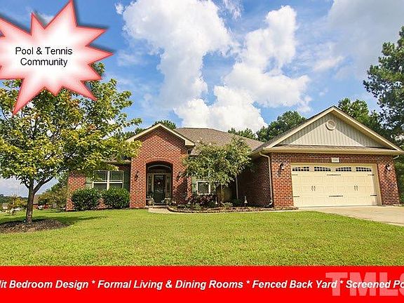 POOL & TENNIS COMMUNITY* ALL BRICK 4 BR/3BA RANCH on Half Acre Corner Lot* Split Bedroom Design* OPEN Floor Plan* Formal Living* Formal Dining Rm w/ Tray Ceiling* HUGE Family Room w/ Cathedral Ceiling, Ceiling Fan & Gas Log Fireplace* Kitchen w/ GRANITE Counters & Tile Back Splash* Master Suite w/ His N Hers Closets, 2 Vanities, Soaking Tub & Separate Shower* Screened Porch overlooks Large Patio & FENCED Back Yard* Great for Outdoor Entertaining! Convenient to Hwy 210 & I 40 for Easy Commute to Raleigh*
