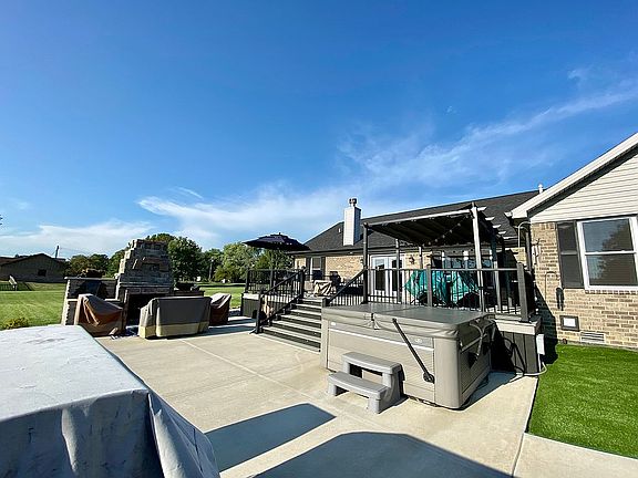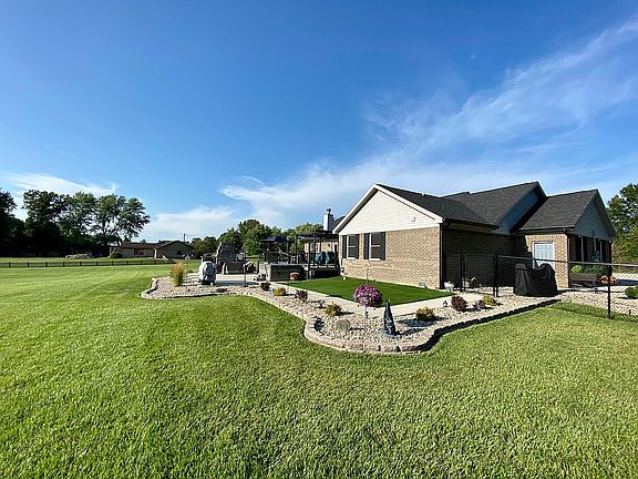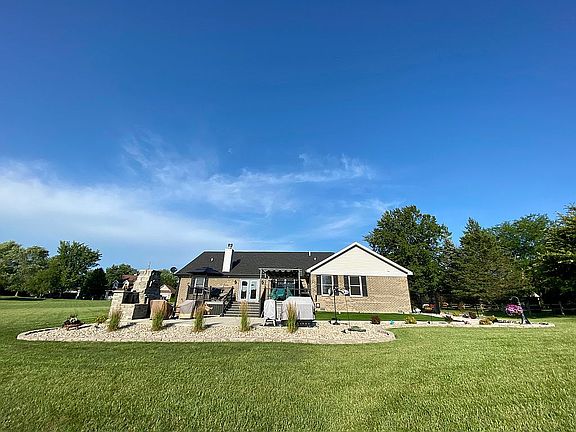 Recently constructed 3 bedroom 3 bathroom home in Bismarck, IL. Large great room with wood burning fireplace. Modern kitchen, complete with black stainless appliances to include refrigerator, gas cook top range, double oven, dishwasher, and microwave. This home also includes a separate formal living room, laundry room, 20’ x 30’ deck, 20 x 30’ concrete patio, two car heated garage with interior water hookups, and epoxy coated floor, a floor drain, and 9 car concrete driveway. Outdoor patio includes a stone fireplace and fountain, as well as a six person Caldera salt water hot tub spa. This outdoor area is perfect for barbecues and entertaining. House sits on just under a 2 acre lot and includes a good sized yard barn. The house has a well maintained septic system and is connected to city water services. The home also comes with a Generac natural gas powered whole-house emergency generator. All light fixtures are equipped with high efficiency LED bulbs. House is equipped with central air and forced air gas furnace, as well as a water softening system. Property is beautifully landscaped with retaining wall block and river rock, and the lawn is impeccable. A beautiful newer home on a quiet street, in a quaint small town with less than 700 residents. Rural living at its finest. This house is also within walking distance of Bismarck Grade School and High School, as well as the local ice cream shop, Andie Mae’s.