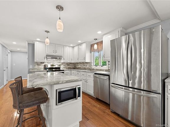 Adorable, turn-key Cape located on large, deep, private lot with finished walk-out lower level. This home has an open floor plan, with a gorgeous, updated kitchen with white cabinets, stainless accented appliances, quartz countertops, marble-tile backsplash and island. Kitchen is open to the living room and dining area. Dining area features a vaulted ceiling with wainscoting, a cool propeller fan and sliders leading out to the large deck. Main level also features an l-shaped bedroom with dressing area with three closets. Two full bathrooms have been updated - first floor with vanity and cabinet, walk-in shower with tiled surround and tile floor; second with tub, tiled surround and floor. Many special touches in this home - wainscoting, floor and ceiling trim, ceiling fans throughout, recessed lighting, tv wall mounts. Enjoy the outdoors from the upper level deck, lower level patio or front porch. Two sheds provide lots of storage for equipment. Circular driveway provides ample parking. Heated attached garage. Central air (4 mini-splits newer windows, vinyl siding, tankless water heater are just some of the other updates.