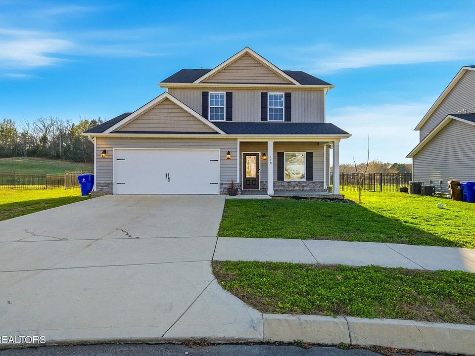 Sitting in the heart of The Preserve at Oak Ridge, 116 Deerberry Lane offers a newer 2022 build with tons of thoughtful upgrades and one of the larger lots in The Willows section. This 3-bedroom, 2.5-bath home also includes a spacious bonus room that could easily serve as a 4th bedroom, giving you just under 2,300 sq. ft. of comfortable, modern living space. Inside, you'll find LVP flooring throughout the main areas and bedrooms, tile in the baths and laundry, and builder-added finishes that give the home a clean, elevated feel. The kitchen was upgraded after purchase with quartz countertops, white cabinets, a sleek tile backsplash, and a full Samsung Bespoke appliance package—yes, the gas range, refrigerator with interchangeable panels, washer, and dryer all stay. The sellers continued improving the home with features you don't normally see this soon after construction: whole-home water conditioning, reverse osmosis systems in both the kitchen and primary suite, an in-ground termite system, an insulated garage with epoxy floors, and a 30-amp EV outlet. Out back, the deck includes a premium $1,800 grill that conveys, and the yard is fully fenced with a 5' aluminum fence and three gates—perfect for pets or kids. Living in The Preserve means resort-style amenities right at your doorstep: indoor and outdoor pools, a wellness center, sauna, gym, pickleball and tennis courts, golf, walking trails, a dog park, multiple parks, and a private marina with boat launch. With new retail, dining, and grocery options planned for the community, this area continues to grow into one of Oak Ridge's most desirable master-planned neighborhoods. This home follows the Willow Master Up floor plan, and the original brochure is available in the listing documents for reference. Buyer to verify all information.