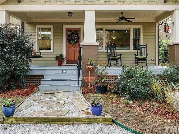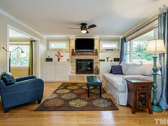 Downtown Cary Living! J. Fike Builders moved and combined two 1950's homes to create this stunning 2012 one-story Craftsman re-build. All the features and systems of the home are akin to new construction. All new siding, roof, insulation, plumbing, etc. Designer upgrades galore! 4 BR, 2.5 baths on main floor. Front and side porches, 2nd floor loft, walk-in attic, & .31 acre fenced yard. Refrig, w/d, & TV/soundbar over fireplace convey. Walk to Downtown Cary. Premier location! Showings begin Fri, 12/7.