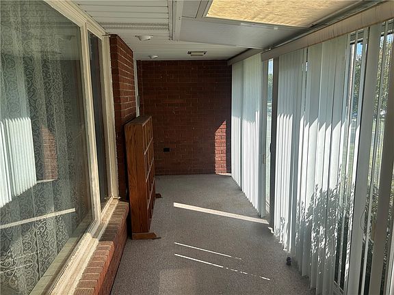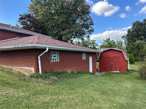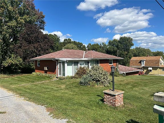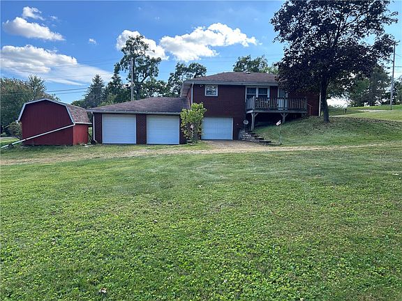 Ready to live off of Main Street in the heart of Saxonburg? Come and see this brick ranch with 3 attached garages and fantastic flat back yard. Enclosed porch allows plenty of sunlight with its wall of sliding doors. Large living room with picture window. Separate dining room. Open kitchen area with access to back deck to relax on. Primary bedroom has triple closet doors to provides all the space you need. Second bedroom has double closet doors. Full bath w/ linen closet and shower/tub is conveniently located between the bedrooms. Coat closet & extra storage closet in the hallway. Basement is unfinished but includes toilet, double utility tub in laundry area and water softener system. Calling all garage lovers..1st garage (13x20) leads into the basement, 2nd garage (14x29) w/9ft door can hold a boat or that extra vehicle and 3rd garage (11x29) w/9ft door already has built-in shelves for tons of storage space! Shed for outdoor equipment is close by. Plaster walls. No-through road!!