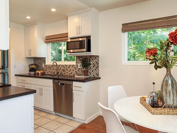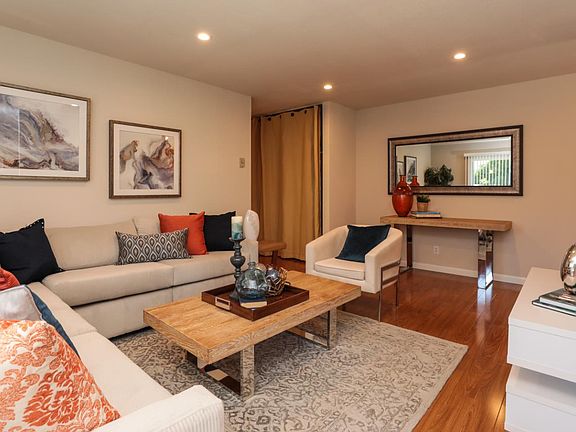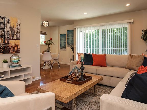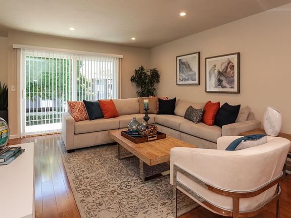 Stunning top-floor end unit condo in Middlefield Meadows complex with no one below. Bright and airy 2-bedroom, 1 bath located in quiet interior location. Large living room with sliding glass door to balcony and adjacent dining L. Upgraded kitchen is accented by shaker style cabinetry, stainless steel appliances, solid surface countertops and decorative tile backsplash. Generously sized master bedroom with walk-in closet plus 2nd bedroom and updated bathroom with shower over tub. Upgrades include dual-paned windows, inside laundry, custom window coverings, laminate flooring and recessed lighting. One-car carport plus additional uncovered parking. Complex amenities include pool, playground and park-like grounds. Easy access to highways 101, 85, 237 and Central Expressway. Great location close to major employers and all that Silicon Valley offers.