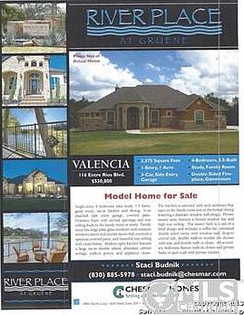 MODEL HOME FOR SALE: Chesmar Homes presents the Valencia. We are building this beautiful home, on 1 acre, in a small, elegant, gated entrance community that has exclusive access to a Guadalupe River park. Inside the turreted entryway you'll find almost 3400 sq ft of easy, comfortable living accented by a huge FR,kitchen,& dining room. 12' sliding glass doors lead to a huge, high ceiling, cov'd patio. Check out the master bathroom. On 1 acre. Brokered And Advertised By: Clay Woodard Listing Agent: Clay Woodard