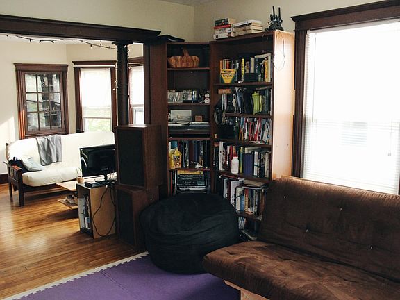 Spacious and bright two-bedroom with an additional office room. Large dining room with built-in cabinet is open to living room with 3 large bay windows. Large entry room with closet and additional storage space. New light fixtures, vanity, and cabinets. Hardwood floors throughout with a large, sunny covered porch. In-unit washer and dryer included, with one off street parking spot. Cats and dogs are allowed with permission. Rent includes water/sewer. Owner occupied building. Rental requirements include credit/background check and proof of income. First month's rent plus security deposit required.