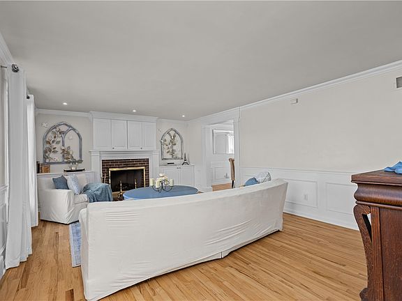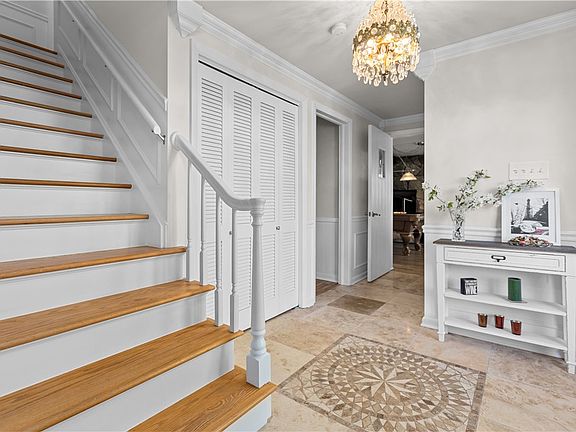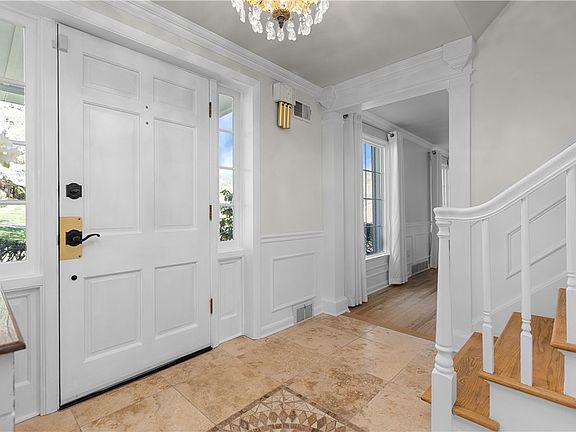 This gorgeous home has been completely updated! The front porch welcomes you into the foyer with custom laid mosaic travertine medallion. Custom crown moldings, millwork & wainscoting. LR features built-ins & custom TV cabinet above gas FP. Beautiful DR opens to the stunning new kitchen with SS, travertine flooring, custom appliance pantry with hideaway doors & butcher block countertop. Den with exposed beams. Gorgeous hearth room with exposed beams, wood burning FP, & French doors that lead to slate patio & portico. Upstairs features 4 spacious BRs with generous closets. Primary BR with walk-in closet & en-suite with new double vanity with Carrera marble countertop, shower & floors. Bright, finished basement & laundry room with generous cabinetry, counter space, storage, built-in bench, party fridge, & large capacity W/D. The airy, circular floor plan & spacious rooms are great for entertaining. Large corner lot with mature trees & perennial flowering shrubbery in perfect location.