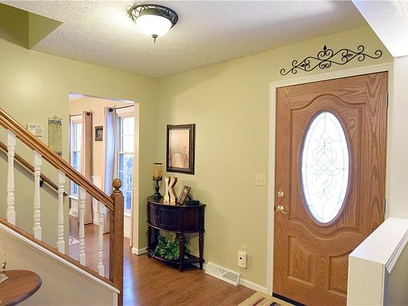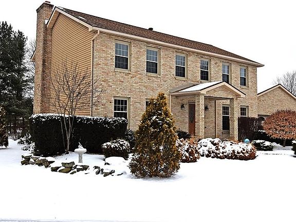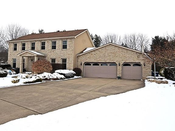 This massive, two-story brick faced home is not one to miss. Standing tall, with a three-car attached garage and brick porch, curb appeal alone draws you inside. An inviting wood trimmed foyer leads you into a lavish, carpeted great room, currently configured for home office. Opposite, a brightly lit formal dining area brings hardwood styled flooring that continues into the expansive centric kitchen area. Here, polished stone countertops wrap around before a tiled backsplash, as stainless appliances accent the charcoal topped island and bar style seating. Daily meals are had with class, beneath a wood trimmed ceiling and surrounded by glass in the enchanting, additional dining room. Near the garage entrance, a half bath tucks neatly beside the kitchen. Upstairs, the master bedroom sits on the far side of the main hall. Inside, a large room reveals rustic wood accents to compliment the bright walls and carpeted flooring. Sliding barn-style doors open to a lavish private bath including skylight, tiled floor to ceiling shower and a walk-in closet. Three remaining bedrooms grace the second floor; two smaller carpeted rooms, and a spacious final room trimmed in hardwood style flooring. Downstairs, a fifth guest bedroom is available along with ample rec space and laundry. An additional half bath is also located nearby. Outside, a fenced in pool area is tree lined for privacy. The yard continues to showcase play areas and an outdoor shed as it makes its way to the tree line.