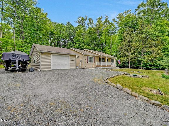 Lake Wallenpaupack Estates Ranch! This home is very well maintained and move in ready. Pulling up to the home, you first see the covered porch, a great spot to relax. Upon entering the front door, you are in the open living, kitchen, and dining areas. To the left, is the primary suite, with large walk-in closet and full bath. To the right of the living area are 2 additional bedrooms and another full bathroom. The laundry is on the main level, which has a door to the side yard. The basement has high ceilings and can be finished for double the living space, TRIPLE LOT! There is a garage for storage and plenty of driveway space for parking your cars or your boat! The community has access to Lake Wallenpaupack for some great fishing, and there is also an indoor pool. Come see it today!, Beds Description: Primary1st, Baths: 2 Bath Lev 1, Eating Area: Dining Area, Beds Description: 2+Bed1st
