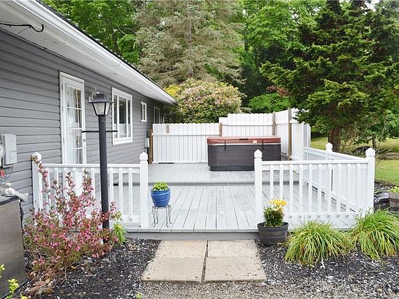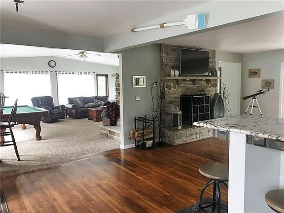 Amazing home for entertaining family & friends, located on one of the best park lots on the lake. Lovely open floor plan featuring inviting dining area complete with wood burning fireplace, hard wood floors, adjacent to the remodeled kitchen w/ granite counters, glass tile backsplash & new stainless appliances. Amazing great room with bar area, loads of light flowing through the walls of windows, striking stone propane fireplace and all new carpeting throughout. Two remodeled baths, open staircase to the lower level highlighted by the galvanized steel railings. Inviting family room, 2 spacious bedrooms, laundry room and second kitchen area complete the lower level. Newly installed metal roof and re-stained decks all recently completed. Enjoy your evenings in the fantastic hot tub. The lake lot with a 25 foot dock area is conveniently located in a cove area, great for privacy, calm water perfect for swimming and kayaking. Lovely grass area at the water for all your lake activities.