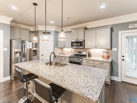 - Features: 10’ + Ceiling, Crown Molding, Granite Counters, Kitchen Island, Pantry, Recessed Lighting, Smooth Ceiling, Wood Floor