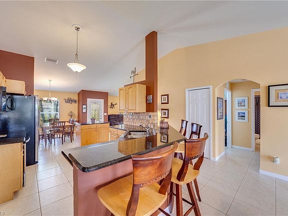 OPPORTUNITY KNOCKS! BRAND NEW $30,000 dimensional shingle roof included & coming soon! Greatroom style floorplan with swimming pool & gulf access canal. Constructed in 2002 and has many features you won't find in most homes, like volume cathedral ceilings & hurricane shutters. The heart of this home is the beautiful & spacious kitchen with raised panel wood cabinets, granite countertops, stainless steel appliances (except microwave) & breakfast bar. Three spacious bedrooms plus a front room perfect for a den or office. Beautiful bathrooms with granite as well. Bring your swimsuit ... Sparkling swimming pool with solar AND electric heat, mansard pool cage & entertainment size lanai. Plus SOUTHERN EXPOSURE for years round pool enjoyment & sunshine. City water & sewer with ALL ASSESSMENTS PAID. This home is on a gulf access canal with ONE BRIDGE to the Caloosahatchee River & Gulf of Mexico. Large wrap around boat dock made of composite material for low maintenance plus a 10,000 boat lift. Save your hard earned money because this low maintenance home is NOT in a flood zone. Conveniently located close to shopping, dining, entertainment & accessible via Veterans Pkwy or Cape Coral Pkwy.