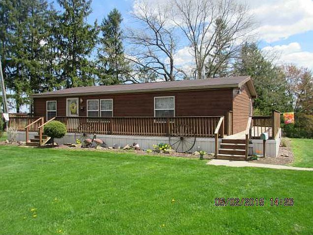 1.28 acres plus 2 detached garages-1car & 3 car. 1 floor living. Nice size kitchen, large living room, master bedroom has walk-in closet and 13X11 bath. Partly covered wrap around deck with nice view. Lots of storage. All electric with central air conditioning. Public water.
