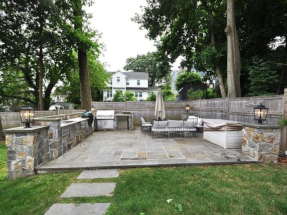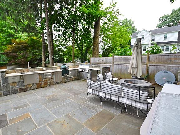 Recently renovated five bedroom home on quiet Fox Meadow cul-de-sac. Access to Hyatt Park. The fully renovated gourmet eat-in-kitchen with custom cabinets, soapstone counters, stainless steel appliances, has a large island with a oven, wine cooler, storage and ability to seat five comfortably. The large living room has a wall of windows, fireplace and two doors leading to the side patio, fenced yard and large outdoor kitchen patio with sink, gas grill and smoker, refrigerator, storage and gas fire pit. The formal dining room has a fireplace and can easily accommodate 16. A full bath, den and mudroom to the side yard and garage finish the main level. A large Main Bedroom Suite has a walk-in closet, seating area and private bath, a second bedroom also has a private bath. Two more bedrooms, hallway full bath and laundry complete the second level. Downstairs is a oversize recreation room, Guest Room/Home Office/den, Utilities and storage. Covered porch from living room. Attached garage and hardwood floors throughout complete home. Close to Scarsdale village shops, restaurants and train to Grand Central. Bus available to elementary and middle schools. Land Lord Pays for water, Tenant pays for gas and electric. Security deposit of 1 months rent. Call listing agent in regards to pets.