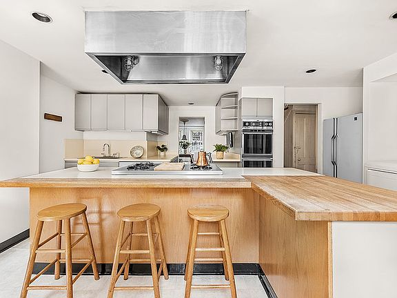Perfectly designed for entertaining, the garden level presents a well-proportioned living/dining room accented by high airy ceilings, parquet wood floors, a stately fireplace, and tall windows for great natural light. The huge eat-in kitchen is a dream for the chef providing a massive island for extra seating and stainless steel appliances. Right nearby is a convenient washer-dryer and a powder room. A door off the kitchen opens to a windowed mudroom that leads out to the peaceful backyard, where you can host barbecues, let the kids and pets play, or read the paper in your lounge chair.