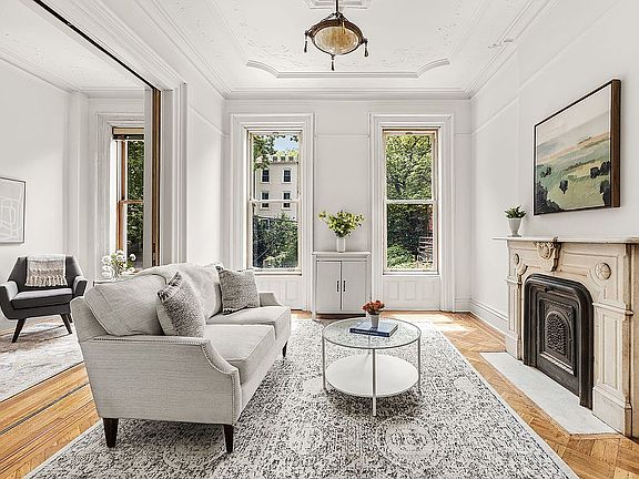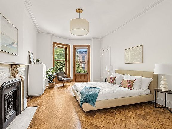 On the third story are 4 bedrooms: 2 oversized with decorative fireplaces, and 2 smaller bedrooms that can be used as sleeping quarters, an office and/or nursery. The front-facing primary suite has plenty of room for a king-size bed plus other furniture, and its own private full bath. Additional bedrooms share a full bath located in the hall. Rounding out this special townhouse is a full basement, and central air conditioning.The address is as irresistible, mere blocks to Grand Army Plaza, the weekly farmer’s market, and Prospect Park. Minutes away are the wide array of shops and restaurants along 7th Avenue, as well as Union Market, Crunch Fitness, local schools, and the 2/3/B/Q trains.