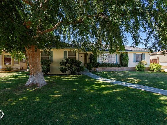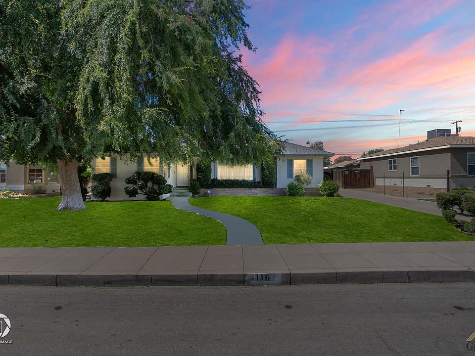 Entertainer's delight! This East Bakersfield home has an amazing sunken great room with custom, vaulted cedar plank ceiling, floor to ceiling stone fireplace, and ample windows bathing the room in natural light. This 3 bedroom, 2 bath, approx. 2,468 sf (per seller) offers great curb appeal and easy landscapes. The formal living and dining room features a brick surround fireplace and chandelier. The kitchen offers plenty of storage with cabinets, built-ins, and a breakfast nook. The primary bedroom features access to the backyard and a large closet. 2 additional nice sized bedrooms offering built in storage. Primary bath includes dual sinks, soaking tub, and walk-in shower. Indoor utility rounds out this easy floorplan. Watch the day turn to evening on your extended covered patio and enjoy the lush, mature landscaping - with a pond! Call now to make this home yours!