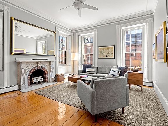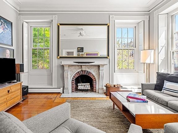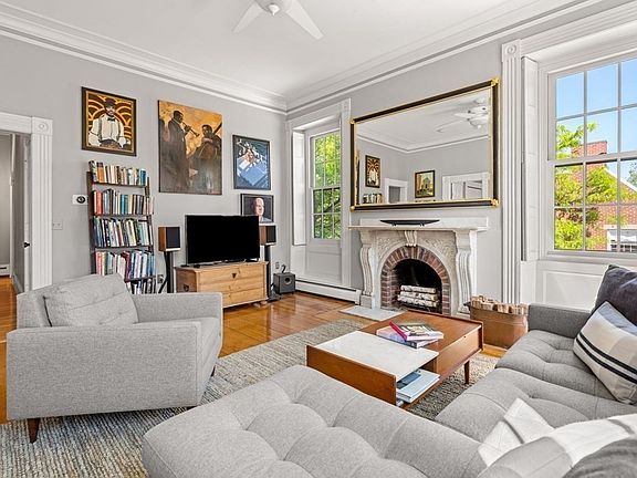 Located in the gas-light district of Charlestown, this historically significant home has been lovingly restored & is loaded with original detail, capturing the essence of a bygone era. The living room is simply spectacular offering floor to ceiling windows with pleasing views, original built-in shutters, ornate white marble wood burning fireplace, cornice moldings, ceiling medallions & pumpkin pine floors. Sunlight streams through this home w/towering 12’ ceilings. The charming step-down kitchen boasts a sloped ceiling, skylights & access to a private deck. Newly restored, the kitchen features all new Miele appliances w/a professional 36" gas range & plantation shutters. The primary bedroom boasts two spectacular windows, cornice moldings, ceiling medallion & a custom cedar closet. Tasteful, new bathroom with custom shower & Veil toilet. 2nd bedroom is ample sized offering original detail & two fabulous closets. Enormous, secured storage in the basement & one off-street parking space.