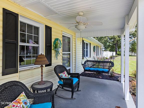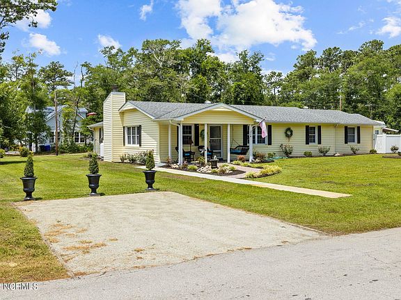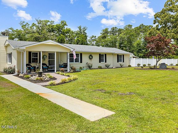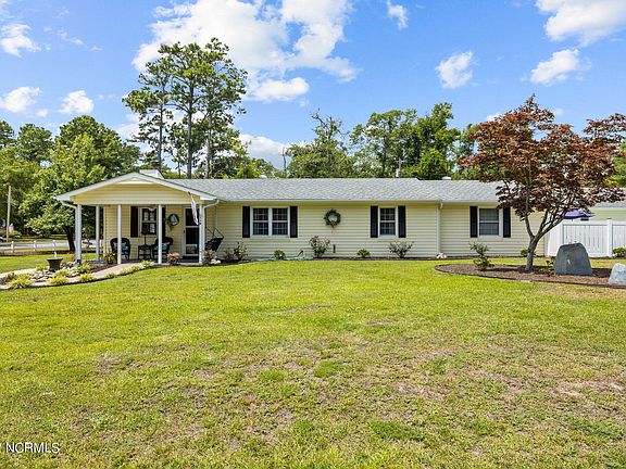 This 3br/2ba Cape Carteret home 2 blocks from the ICW will knock your socks off! Beautifully manicured landscaping on this HUGE DOUBLE LOT! Sprinkler system in place! This home has been well-maintained and has had many upgrades, to include HVAC 2021, kitchen countertops & backsplash, LVP flooring in dining room, bathrooms, & primary bedroom, tile floor in kitchen, newer carpet in living room and 2 guest bedrooms. Outside you will find an in-ground pool, surrounded by expansive concrete decking- plenty of room to party! There's even a separate area to grill! The entire area is enclosed with vinyl privacy fence. A large driveway leads to a detached 2-car garage & small room with window A/C unit- could be an office or a changing area for the pool! Need a place for your boat or RV? How about both! Check out the huge wired carport! Home is wired for generator, but no whole home generator is installed. However, a portable one would convey- never been used. There is a lean-to which holds the pool equipment, and storage closets along the side. This home withstands storms, being built with concrete block & lovely vinyl siding covering. NO FLORENCE DAMAGE! Many furnishings may be negotiable. This property would even do fantastically as a rental! Estimated $20,000-$28,000 gross/yr as vacation rental!