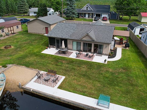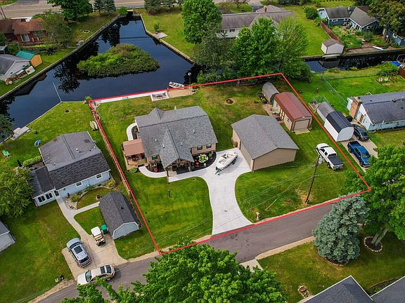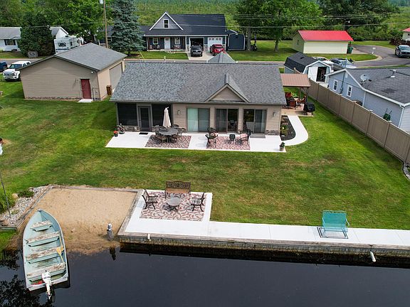 Luxury canal front. Newly remodeled flooring, windows, interior and exterior walls, cabinets, countertops, roof, furnace, well, water softener, hot water heater, plumbing, electrical, concrete, appliances, second 14x27 garage, shed, 4 sliding glass doors, cabinets, walk-in shower with blue tooth installed device, toilets, custom wiring, recessed lighting. This 2 bedrooms 2 bath 1472sq ft home offers master suite with walk-in shower, private bathroom, walk-in closet, attached sunroom, vaulted ceiling, water view from living room, dinning room, kitchen , master bedroom and sunroom. 155 ft of canal front with seawall, sandy beach area and sandy bottom, lush green lawn 30x36 garage. 1 year Boat slip at Bayview Marina across the street from home is included in sale.