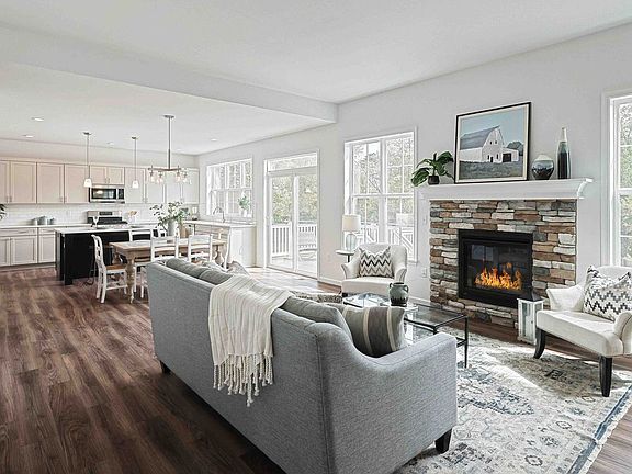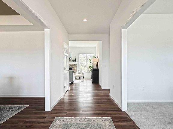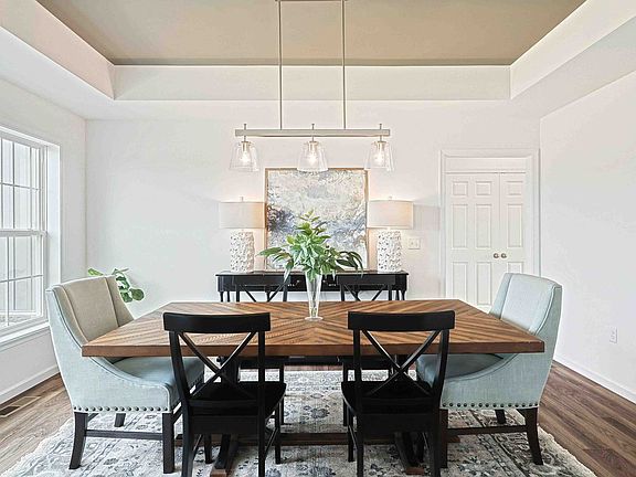 This stately 2-story home with an inviting front porch has a 2-car garage and 9' ceilings on the first floor.. A mudroom entry from the garage features a large pantry. Stylish vinyl plank flooring flows throughout the main living areas. To the front of the home is a dining room with a tray ceiling and opposite the foyer is a carpeted living room. The kitchen, featuring quartz countertops with tile backsplash and stainless-steel appliances, opens to the sunny breakfast area with sliding glass door access to the composite deck. Adjacent to the breakfast area is the great room warmed by a fireplace with stone surround and a carpeted study. The second-floor owner's bedroom, accented by a tray ceiling, opens to the bathroom with double bowl vanity, tile shower, and an expansive closet. Three additional bedrooms, a full bath, raised rec room, and laundry room complete the 2nd floor. Amenities: Basement w/ Outdoor Access, Rec Room