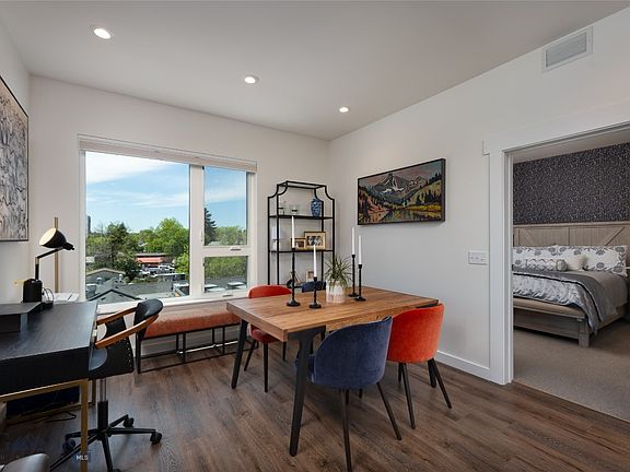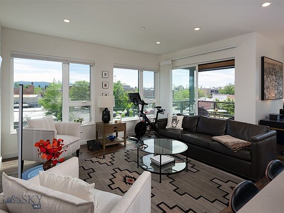 Enjoy all that downtown has to offer from this luxury corner unit in the Merin, Bozeman's premier condominium building located just two blocks north of Main St. Step inside and take the elevator up to this beautiful home. With views to the South and West, the enormous windows capture stunning sunsets and mountain vistas, creating a bright and airy living space. Enjoy carefully curated finishes with design upgrades throughout. The living area is spacious, featuring a dedicated dining area perfect for entertaining. Both bedrooms are en suite and offer generous closet space. The laundry room provides ample storage, and a conveniently placed powder room is located off the living room. Enjoy your patio all year long, taking in the mesmerizing twilight displays. Additionally, the Merin boasts a fantastic common area patio on the second floor. With views to the East, you can enjoy the sight of the Bridger Mountains from this expansive courtyard. This unit includes one parking spot in the heated garage. Don't miss your chance to own this superior condo in the heart of Downtown Bozeman.