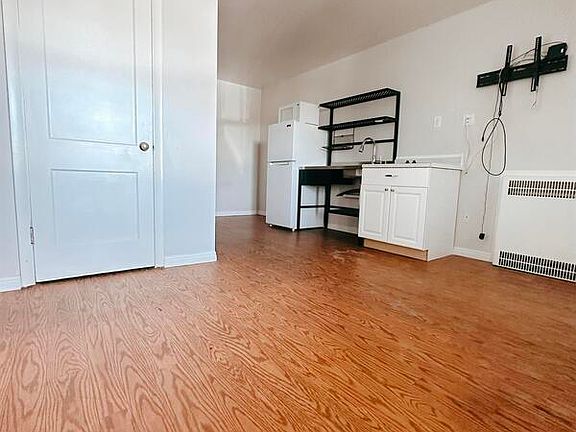 This cozy studio apartment features a functional kitchen complete with a refrigerator and microwave.