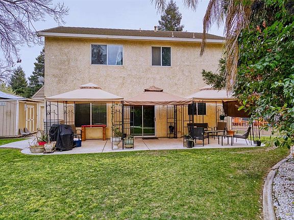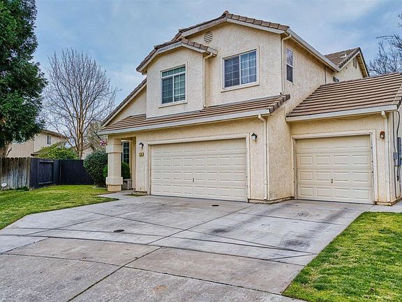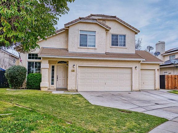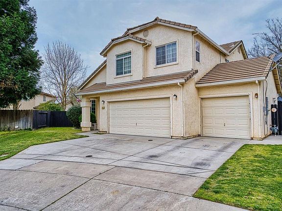 Beautiful home located at the end of a cul-de-sac with spacious bedrooms, large manicured back yard and room for a RV, boat and other toys. As you enter the house there is new laminate flooring on the entire first floor and stairs leading to the second story. The kitchen is large with many cabinets, an island and a window looking out into the wonderful yard. This home has a front family room and dining room combination with a gas fireplace and spaces for your entertainment devices, books or storage. There is a separate living room that flows into the eating area and kitchen. Upstairs you will find French doors leading to the master suite with dual vanities, separate shower stall and tub and a walk-in closet. All the bedrooms are spacious and there's a whole house fan upstairs to keep things cool during those summer months. Most of the rooms have ceiling fans and the bedrooms have walk-in closets. The backyard is perfect for entertaining. A large extended patio awaits you with canopy covering, curbing, flowers, fruit trees and more. The 3 car garage includes storage cabinets, plus the 3rd bay opens to the backyard with a shed for extra storage.