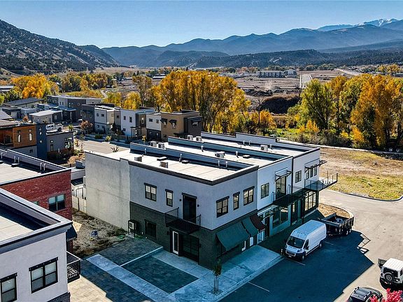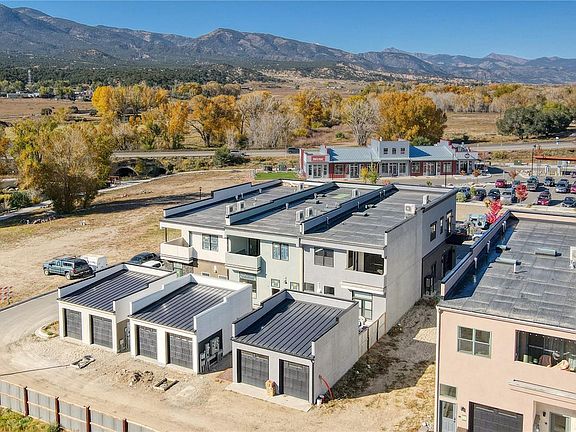 Stunning corner condo with a well-considered layout, private entrance, 9' ceilings, large south-facing windows, offers full time or income opportunity in a desirable Two Rivers Commons! This two bedroom/two bath condo sets itself apart from other area offerings with a corner location, additional windows and an abundance of natural light, southern-exposure, covered second-story deck with cedar lid and soffit, and an additional balcony. Plus, the convenience of an alley-access single car garage w/storage locker and a dedicated off-street parking space. Situated on the southeast corner of the building the primary bedroom opens to a 120 sf covered deck with cedar accents and long views of the Arkansas Hills; second south-facing bedroom offers private custom steel crafted balcony and private access to full bath; open-concept floor plan with designated dining area; kitchen offers modern slab-front cabinetry, bar seating, quartz countertops and stainless appliances; gorgeous white oak floors throughout, plus in-unit laundry (stackable washer/dryer included) and private entry. Designed with modern industrial vibes in mind, low maintenance exterior showcases stucco, stone and custom structural steel. Located in just steps from the South Arkansas River, walking distance to +/- 7 acres of riverside riparian open space, adjacent to the Two Rivers residential communities and one mile from Historic Downtown Salida. The Commons is designed to be a contemporary, walkable, live/work commercial neighborhood that integrates the convenience of off-street parking and high speed EV chargers with common elements intended to bring commerce outdoors, engender community and take advantage of a natural setting that incorporates a river walk, mature trees, and mountain views. Enjoy the flexibility of living here and generating in come when you travel. Short term rentals are allowed; city licensing requirements apply. Estimate Completion: Dec 22/Jan 23.