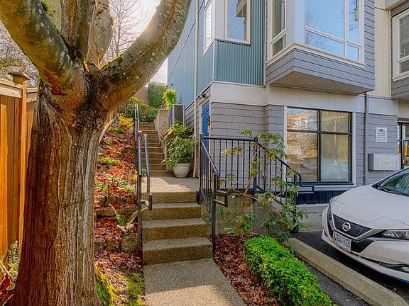 A contemporary urban design 2 level townhouse in the heart of Duncan. Artfully designed to allow maximum sunlight with impeccable taste. Enjoy a new chef style kitchen complete with new appliances. An infusion cooktop, convection oven plus a sit-up peninsula. Quartz counters, touch to open cabinets and kick drawers, valence with slim line under counter lighting, a 18 gauge double sink. The living room is open and spacious. Up features a Master Bedroom with high ceilings and celestory windows, plus a balcony for morning coffee The bathroom is updated with a floating marble top vanity, dual flush toilet and porcelain tiles. The 2nd bedroom at the back is a quiet sanctuary. Plush eco friendly new carpets in bedrooms, hallway and stairs. Easy care laminate flooring on the main, new high quality blinds. The back patio is fenced for privacy in a serene nature setting. Shopping and cafes are right outside your door. Newly installed bike lanes connect to trail systems.