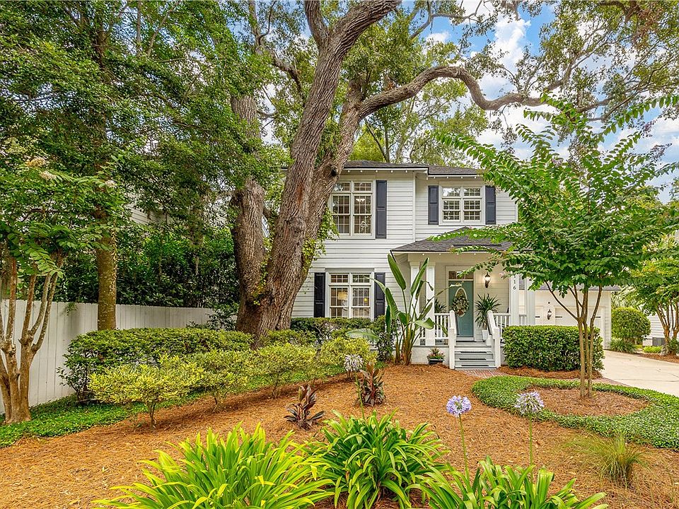 NEW ROOF! Welcome to 116 Rosemont-a Southern coastal cottage full of charm, updates, and character, nestled under the canopy of live oaks in the beloved Harrison Pointe neighborhood on St. Simons Island. Located on a quiet tree lined street, this move-in-ready home offers curb appeal, privacy, and easy access to the beach, shopping, dining, and off-island routes. The white exterior with black shutters and inviting rocking-chair front porch set the tone for the warm, classic style inside. Hardwood floors, detailed millwork, and natural light flow through every space. The living room features a wood-burning fireplace flanked by custom built-ins, and double French doors open to a flexible home office or den. The kitchen combines function and charm with beadboard cabinetry, butcher block countertops, stainless appliances, natural gas range, and a hidden appliance garage. A sunny bay window breakfast nook overlooks the lush backyard, where winding landscaped trails create a private courtyard feel. A pocket French door connects the kitchen to the dining room, which opens to the covered back porch with ceiling fan, leading to the detached 2-car garage. Upstairs, the primary suite offers two closets, a tray ceiling, and a cozy sitting area surrounded by windows. The ensuite features a soaking tub, walk-in tiled shower, and dual pedestal sinks. Two additional bedrooms, laundry and a full guest bath complete the second floor. Key Features & Updates:3 bedrooms - 2.5 baths; Flood Zone X - no lender-required flood insurance; Roof replaced in 2023 One HVAC replaced in 2023 + 2 smart thermostats; Water heater replaced in 2023; Detached 2-car garage with breezeway to covered back porch; Low HOA dues - just $350/year; Natural, low-maintenance landscaping with courtyard-style backyard * Quiet location in desirable, tree-lined community * Only 7 minutes by bike to the beach, and just 5 minutes to shopping, restaurants, and the movie theater. * Quick access off the island-just 10-12 minutes to the causeway-makes this a rare find for both privacy and practicality.