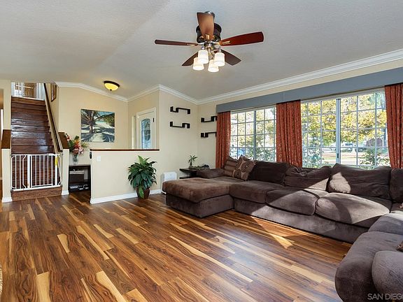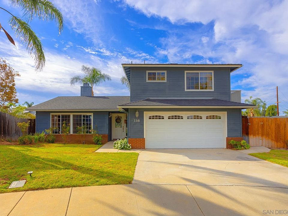 New to market is this updated and beautifully remodeled home in El Cajon in the highly desired highly desired Granite Hills Manor Community. As you enter, notice the new vinyl plank flooring throughout and the spacious living area centered by a stone fireplace. FIRST FLOOR BEDROOM! The large kitchen is adorned with high end cabinetry and light granite countertops complimented by newer stainless steel appliances. Upstairs are 3 more bedrooms and remodeled bathrooms. Designer lighting touches can be noticed throughout the home and each bedroom has ceiling fans. In the primary, enjoy an oversized updated bathroom with beautiful finishes and plenty of cabinet space and storage. Outside, relax in the hot tub overlooking the large yard that has been upgraded with paver stone and high end turf for low maintenance outdoor living. The exterior of the home also features a newer roof and owned solar panels which were installed just two years ago. This is a turn key ready, gem of a home!!