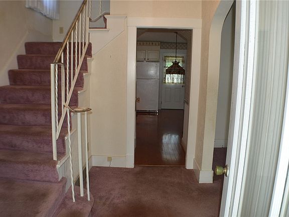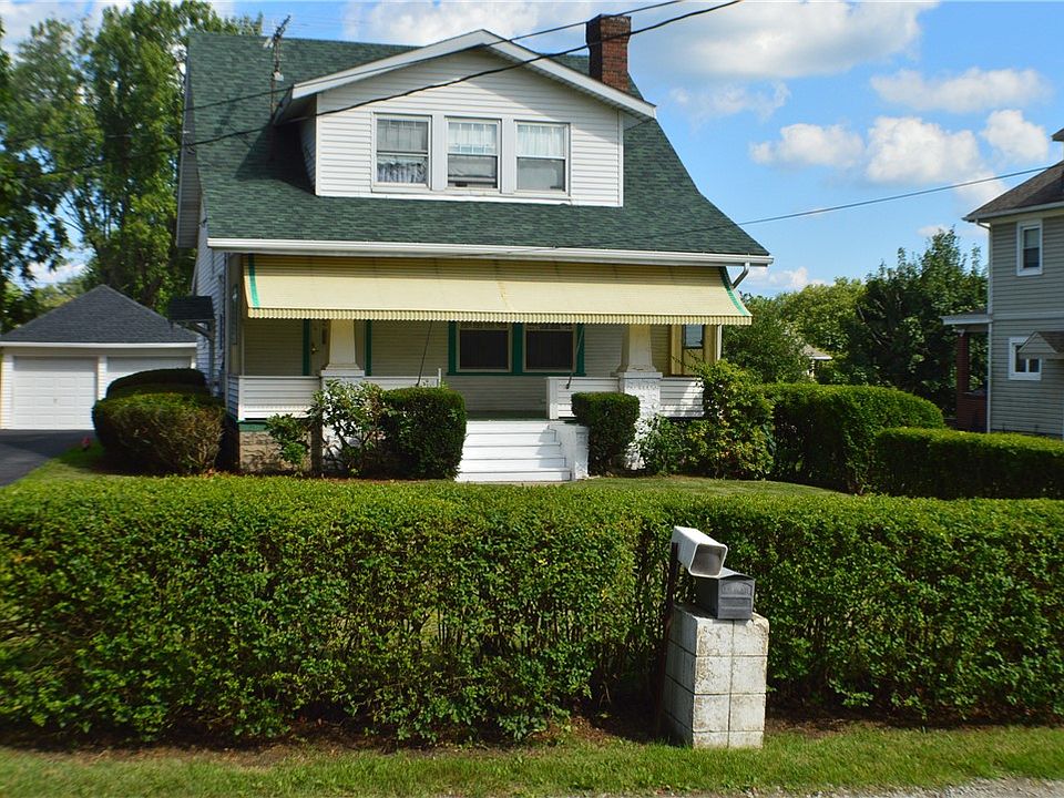 2 story, Cape cod style residence with 3 bedrooms and one bath, all on the second floor. Big, shady covered front porch. Entry with coat closet is open to a large living room with big front windows and decorator fireplace. Dining Room has great built-in corner china closet. Kitchen is full of creamy white cabinetry, laminate wood-look flooring, white electric range and refrigerator stay. Kitchen is big enough for a table and chairs under the hanging light fixture. Full basement has laundry area and plenty of storage. A sump pump keeps it dry and handles laundry tub drainage. 150 amp breaker box, oil forced air furnace. 2 car detached garage with one auto door and one manual, has brand new roof, concrete floor is cracked up, as well as front walk way. Great level yard with a couple of big shady trees. You can move right into this one and do a few projects on weekends. New vinyl siding to be installed in the next few weeks. Buy now and pick the color!