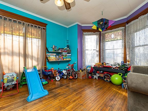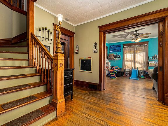 A spacious and stately Queen Anne-style home presides over a corner lot in Warren, Ill., waiting for a new owner. This well-loved home has 5 bedrooms, each with its own closet, and 1.5 bath. The exterior has features and decorative accents typical of the Queen Anne style, including a turret, decorative trim and siding, and a roof finial. A covered front porch provides access to the home, and upon entering, the staircase's large finial, complete with light, commands immediate attention. Warm hardwood floors connect the rooms on the first level, and wood archways and woodworking accents help create a unique and interesting interior. Sizable windows are generously located throughout the first floor, bathing the interior in natural light. The kitchen has plenty of storage space and accompanies 2 large sitting rooms, a dining room and a laundry space on the first floor. Bedrooms are located on the second floor, which also includes the full bath. The property has a 1-car, detached garage. Come see this inviting home today.