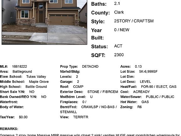 Like new, 2-story craftsman home in heart of Battle Ground! Open floor plan w/ rich, handsome finishes throughout. Kitchen w/ beautiful S/S appl's, pantry, Shaker cabinets w/ accent lighting & peninsula eating bar overlooks eating area. Spacious FR, LR & DR w/ high ceilings. Vaulted mstr suite includes bath w/ double vanity, tile counters & walk-in closet. Large guest bdrms. Upstairs laundry rm. Fenced yard w/ sprinkler system. RV pkg.