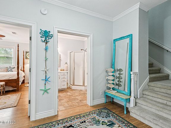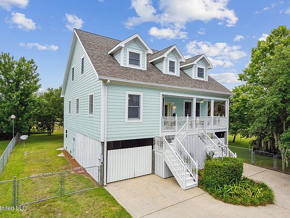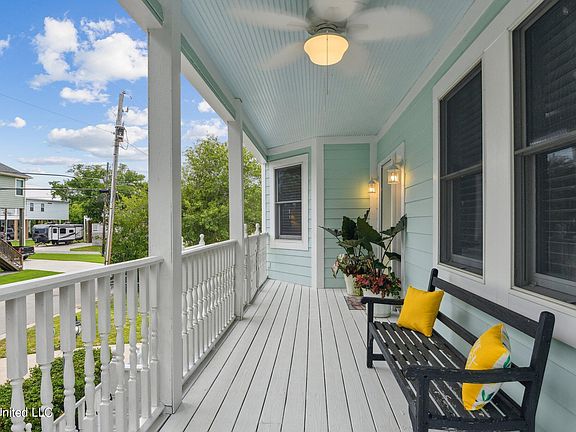 a few STEPS to the white sandy beach, and located in the highly sought after Bay/Waveland beach area. Custom built by its prior owners, the home was designed to be sturdy and quiet with 6 inch thick walls and strategically placed windows to bring in natural light and breathtaking views of the Mississippi Sound. If you love nature in all its splendor, then you will be right at home. The large porch wraps around the front, side and back of the house allowing moments of peace and pleasure as the sun rises over the water and sets in the evening painting the sky and water in pastel masterpieces. Sea breezes laden with salty-sweet perfume makes its way through stately palm trees creating a gentle rustling sound, while mature live oak trees dripping in Spanish moss sway in a harmonious dance. The fenced in yard itself is a treasure house of nature, which includes a lovely babbling fish pond full of goldfish. With 2100 square feet of living space, in-line water filter, 9 foot ceilings, electric fireplace, two master bedrooms ensuites and an additional third bedroom and full bath, you have plenty of room for the entire family. Underneath the house is a great entertainment area, porch swing, elevator, two parking bays, covered rain entrance, and an air conditioned 1 & 1/2 car garage. Enjoy a front row seat from your own deck to enjoy holiday Fireworks over the water, or walk to Food Truck Friday on Coleman Avenue, or hop in your golf cart for a quick ride to The Bay for shopping and dining. The home comes mostly furnished with a few exceptions and move-in ready. Run, this one will not last.