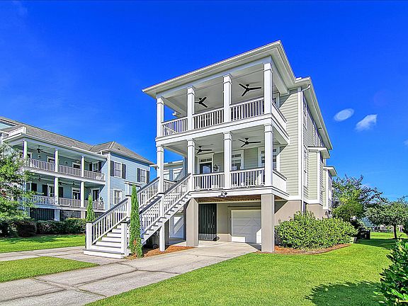 Boasting the largest and most flexible floorplan in Shell Ring, this gorgeous 4 bedroom, 3.5 bath residence is perched on the most amazing lot with pond + star gazing views. This beautiful elevated Southern home exudes Charleston charm with its double front porches and an entertaining outdoor living area which incorporates screened-in porch + huge deck overlooking pond on main level and a covered patio, grilling area and custom-built fireplace in the expansive and level backyard. The interior offers high ceilings and oversized windows bringing in that Carolina sunshine. Main living level includes gas-fireplaced living room, separate dining area, den or additional bedroom, large eat-in kitchen + private owner's suite w/ beautiful dual vanity bath, expansive walk-in closet + laundry room.Upstairs you'll find a wonderful and flexible configuration including two en-suites + third bedroom and loft area w/ access to upper front covered porch. Both driveways lead to their own deep garage bay w ample storage + workshop area and at the rear of property is an additional heated/cooled flex space which can be utilized for fitness room, party cave or rec space leading out to amazing outdoor living area. Beautifully maintained home w/ new roof, recently installed Heating/AC, exterior newly painted. Located just minutes to the airport, beaches and downtown, Shell Ring on St Thomas Island, zoned for Daniel Island schools, gives you easy access to coveted Daniel Island attractions including restaurants/bars, tennis and music concerts at Credit One Stadium, fitness clubs, cafes, walking/jogging paths, all from the quiet confines of Shell Ring - the best kept secret on the island!