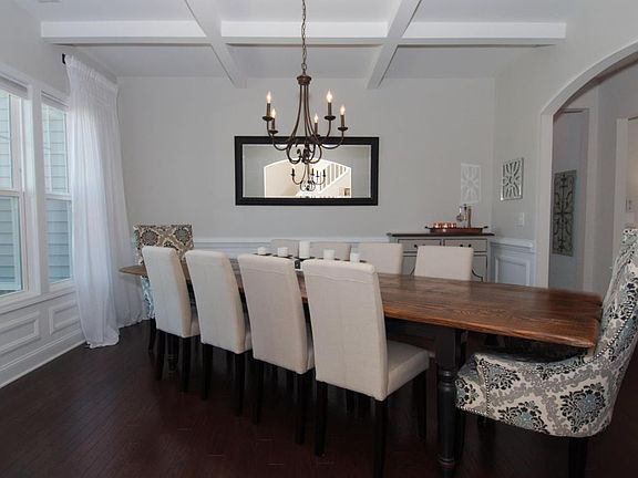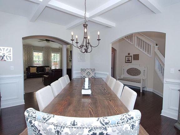 Prepare to fall in love with this stunning home! Featuring 4 bedrooms, 3.5 Baths, and a large bonus room. As you enter the two-story foyer, you are met with natural light and a picket railed staircase. To the left is the formal dining room finished with wainscoting and coffered ceilings. In the living area, each room is framed with arched openings and columns. The living room has tall trey ceilings, a gas fireplace, and shiplap walls. In the kitchen, you will find stainless steel appliances, granite countertops, a large island, an abundance of cabinets, a walk-in pantry, and a breakfast nook. Walk out into the fenced backyard and experience a resort feel oasis! The custom pergola is finished with stone columns, stone paved look concrete flooring, and hanging lights on a dimmer...