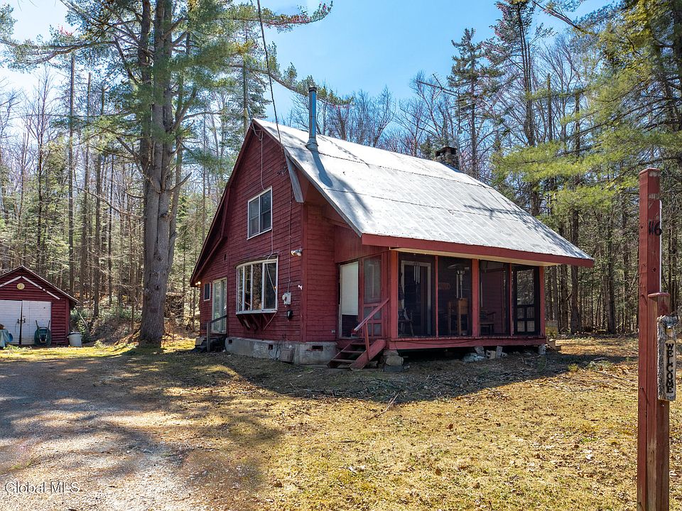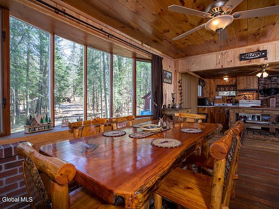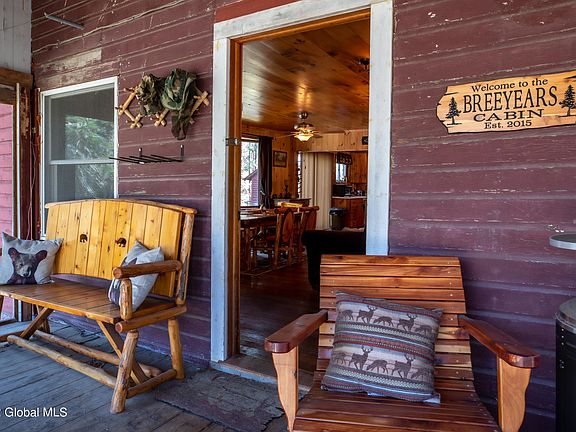 Nestled on a idyllic tree-lined road. This seasonal two-story Cabin features a large open living/dining space with a picturesque window, stone wood-burning fireplace, two wood-stoves, hardwood floors, 2 bedrooms, 2 bath. Custom features, and comes furnished. 144 sq. ft. front porch over looking the mountains, 12x21 garage, 6x4 outdoor bbq, and fire pit. 3 mins to ''OK Slip Falls trailhead'' one of the highest waterfalls in the Adirondacks. 9 mins to Gore Mountain, and minutes to many Hudson River public access points. A must-see property for those who love the Adirondacks.
