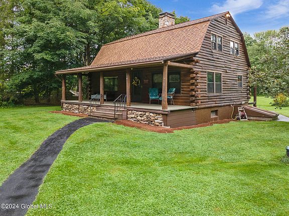 Live the good life in this classic 3 bed, 1.5 bath log home w/huge 4 car garage on a picturesque & private 3.45 acre lot. You'll love the rustic charm & flowing floorplan of this well maintained home. Savor nature relaxing on the wide front porch. Whip up tasty meals in the custom crafted kitchen w/feature stained glass accents. Unwind in the spacious living room w/stunning stacked stone fireplace. Rest easy in the ample primary bedroom w/built in storage. Enjoy forced air heat & central A/C on the 1st fl w/electric heat on 2nd fl & whole house generator. Enormous 4 car garage has space for a workshop. Finish the 2nd fl for the perfect rec room. 3 acres of invisible fence to keep your pup safe. Well produces 20gpm. 14 min to I88, 36 min to Western Ave/Crossgates Mall, 34 min to GE Schdy.