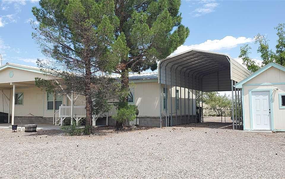 Two homes on 1/2 acre close to Elephant Butte Lake and Truth or Consequences. Main house is a 1456 sq ft permanent manufactured home with 3 beds and 2 baths and refrigerated air. Open concept kitchen/dining/living room. 3rd bedroom has outdoor access. Sliding glass doors lead to a large covered patio and low maintenance back yard. Front patio is also covered and extends the width of the house. There's covered RV parking with hookups, two storage sheds- one also serves as well house. Both front and back yards are on a drip system. The guest house is approx. 780 sq ft with a full kitchen, bathroom, laundry room- including washer and dryer, bedroom and living room. It also has a 270 sq ft covered porch. A wood fence provides privacy from the main houses' back yard. Guest house currently rents for $400/month.