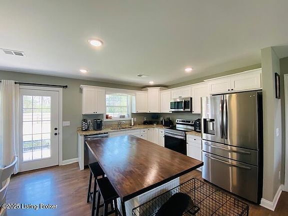 Good as new three bedroom two bath brick ranch style home in Big Springs Subdivision. Home offers a desirable open split floor plan with smooth ceilings & nice vinyl plank flooring throughout. Eat in Kitchen with white cabinetry, island bar with butcherblock & stainless appliances. Separate Laundry room is an added bonus. Primary suite located on one side of the home with Primary Bath offering a double sink vanity. Two additional bedrooms & hall Bath are located on the opposite side of the home which allows for the utmost in privacy. Outdoor features include a nice rear patio, fenced yard & shed for additional storage. Located minutes from all the amenities of historic Bardstown, Ky. Let's go take a look today!