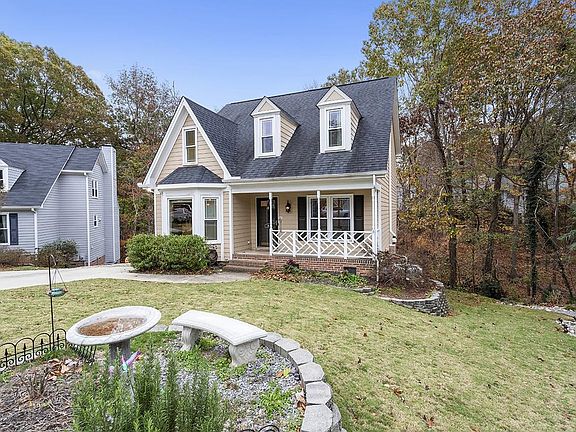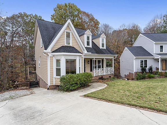 Immaculate story book Cape Cod on a Cul-de-sac with two primary bedrooms. Entry welcomes you to a bright family room, dining room with bay window & New light fixture, and kitchen with granite countertops, gas range for the chef and New Refrigerator! Flooring includes maple hardwoods, Brazilian Cherry, cork and laminate- you will not find any carpeting! Smooth ceilings, updated windows and baths. You'll find a large Rec room/Gym in basement as well as an unfinished wired workshop and tons of storage. You can enjoy a private view of a wooded buffer and Cary Greenway from your porches and patio in your fenced yard. House wired for Ethernet and high speed google fiber. Google Nest video doorbell, outdoor google Nest security camera, upgraded programmable nest Thermostats. Low maintenance grass sod in front yard. Your new home is minutes to beautiful parks, restaurants, shopping, RDU airport and RTP. Your new home has all the bells and whistles. It's waiting for you to move in and celebrate with a glass of champagne!